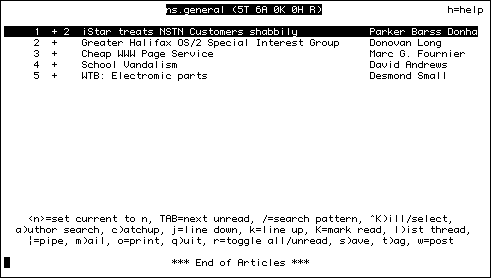 From the list of news groups users can select a particular newsgroup, which brings up a list of threads for that newsgroup. From there the user can select a particular thread and read the message.