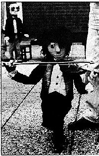 Alex epitomizes the talent, dedication, comraderie, originality and all-round chutzpah that are characteristic of this remarkable group of people. The ex-patriate Yugoslav marionette group, Arthur & Co., has been on tour for five years! Self-taught they've set-up their show on the cobbles of virtually every European country which has let them in. They've developed their own specialized techniques of manipulation, their hands dancing like demented spiders tangled in a web of strings and sticks. Their marionette characters are a cast of of crooning, strumming nightclub musicians manipulated with a whimsy that appeals to adults and children alike.
