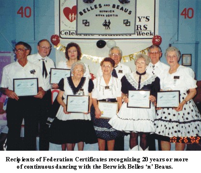 Kings West MLA, Jon Carey presented the Belles 'n' Beaus with a certificate of accomplishment from the Nova ScotiaGovernment. The Town of Berwick representative, Mike Trinacty, welcomed the dancers and guests to the town and also offeredcongratulations to the club for their accomplishment. He briefly listed many of the events and activities the Belles 'n' Beaus have beena part of in the Town of Berwick over the past 40 years.
