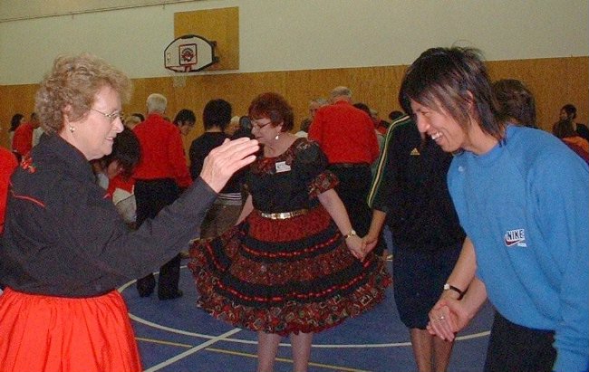Although the Tantramar Twirlers of Sackville NB, and the Cumberland Twirlers of Amherst NS, are separated bya provincial border they are actually nearest neighbor square dancing clubs and not infrequently get together. One such event took place on November 6, when the clubs jointly provided a square dancing experience for more than fifty Japanese students enrolled at Mount Allison University in the MASSIE program. This program (MOUNT ALLISON SOPHOMORE SEMESTER IN ENGLISH) now in its seventh year, brings thesestudents here for about three months, during which time they are introduced to "aspects of life in the Tantramar region"and naturally this includes square dancing. The consensus among our dancers was that the students were quick learners and soon overcame language limitations, as demonstrated by their enthusiasm and smiling faces. -- Douglas H. Grant.