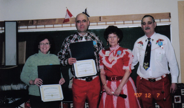 Sunrise Square had their Christmas dance Dec. 7/07 with a good turn out of dancers and guests from La Have River Ramblers. As usual the food was plentiful and everyone stayed for the feast after the dancing was done for the evening. Federation Presidents Valerie & Ralph Brown presented longevity awards to Neil & Kathy Dorey (below).