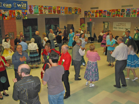 Crowding the school cafeteria, four squares of dancers are eager to start.