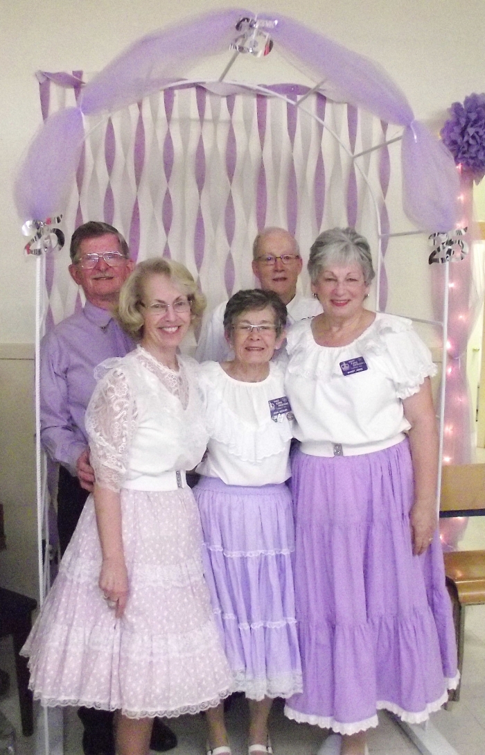 Nelson and Laurie (picture below) provided lists of all the classes they taught, so former members could be invited. Well wishes were received from the Federation and neighbouring clubs and throughout the evening, past-presidents were introduced. The decorating committee decked the Hall in lilac and white for the occasion. A bulletin board of pictures provided many “I remember” comments throughout the evening and Dave Longley and his camera recorded this new event in our history. A 50/50 draw was held and the winner received $120. Our president couple and their committee organized an outstanding celebration enjoyed by all.