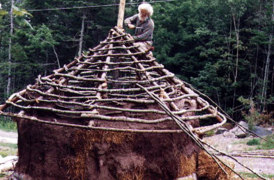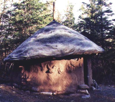 Spruce trees (five inch diameter) were lashed to a centre pole, then left to rest on the wattle and daub sill. Alders were used to create a series of concentric rings which were nailed to the rafters, these were spaced about every two feet. Burlap was stapled to the rafters. Roofing tar was painted onto the burlap and sand thrown into it before it dried, creating a kind of instant asphalt