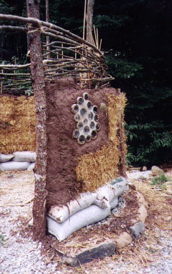 The relief works on this structure are the gifts of hands young and old. The creatures you see were shaped with "cob". Cob is a traditional mix of clay, sand and straw which is highly sculptural and is used to create monolithic walls and other forms, including bread ovens. It is an excellent source of thermal mass and is easy to do with minimal tools. Labor intensive but fun!