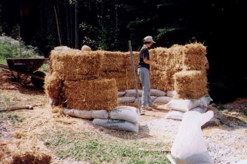 Two - string straw bales were laid on the foundation in a running bond four courses high. Sapling lengths (three inches in diameter) were set every three feet along the inside and the outside of the wall to hold the bales in place. Baling twine laid between the bales was tightly fastened to the saplings on either side of the wall to hold the bales in place.