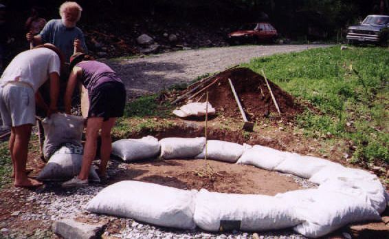A drainage trench a foot deep and filled with gravel will direct water away from the site. The principal being, if water can be directed away from the foundation then there will be nothing to precipitate the usual heaving. The site was leveled, cutting slightly into the hill. Recycled polypropylene feed sacks were filled with gravel. These were secured closed by stitching them with nails. The bags were laid out in a running bond.