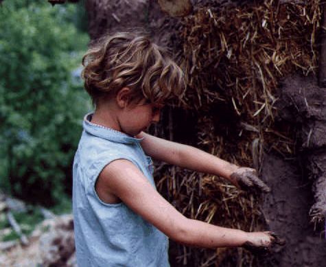 This shelter was built in August, 1996 during a workshop led by Joseph Kennedy from New Mexico and Straw Bale Projects. The Round House was originally intended as a "chicken dream home", but the children claimed it for themselves before the hens could move in. The design was inspired by the Spanish architect Gaudi and by our quest for simple systems which respond well to the unique properties of straw bales.