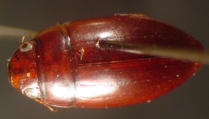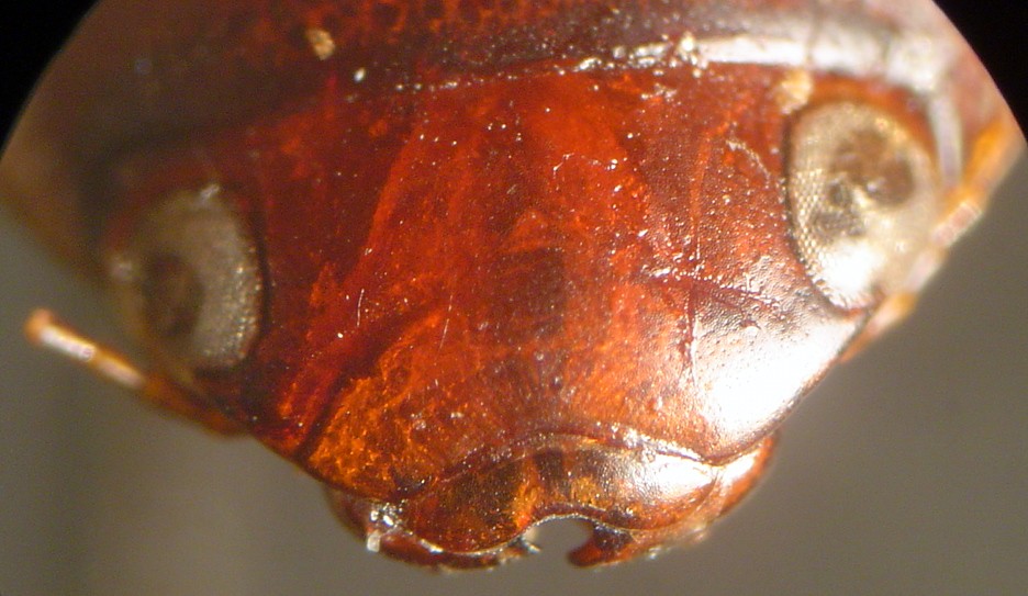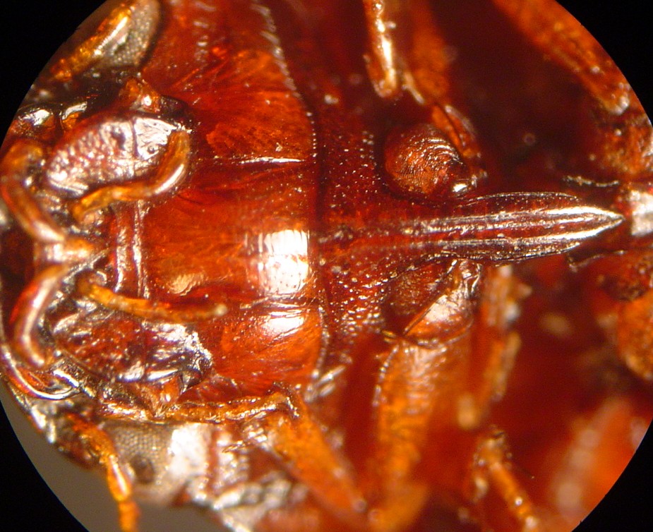 The specimen is 8.5 mm in length and is a uniform dark rufous in colouration. Note the deeply sulcate prosternum and prosternal process and the broadly emarginate anterior edge of the clypeus which are characteristic of this genus. The mextacoxal plate is micro-reticulate (not really visible in the photograph below) which helps distinguish this species from others in the genus. There are only four species in this genus which is restricted to North America. Only one other species (M. bicarinatus Say) has been recorded in Canada.