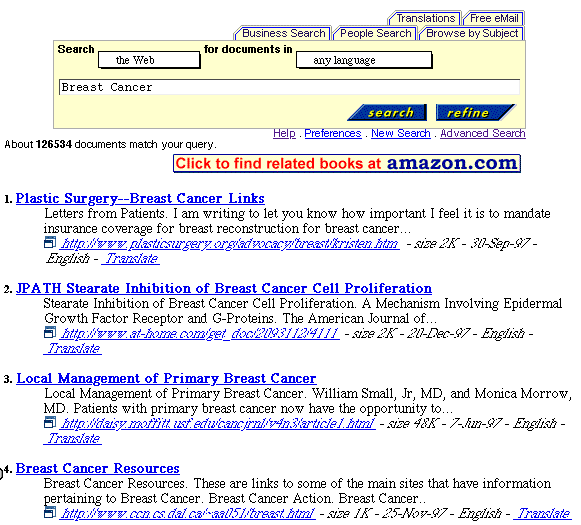 'breast cancer' on AltaVista. You'll note that there were 126,534 pages of